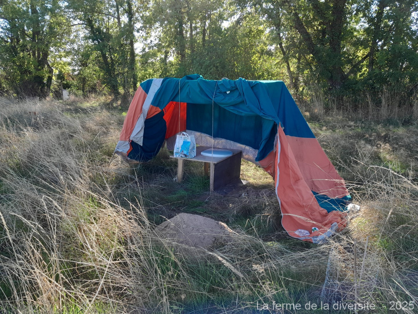 Via de kleinere wegen met de moto naar Crevant rijden en wildkamperen, dat deden Stephan en Yannick. Speciaal voor hen had ik een gezellige droge wc in elkaar geknutseld. Het was even wachten op het eerste gebruik, maar ze werd uiteindelijk goedgekeurd.