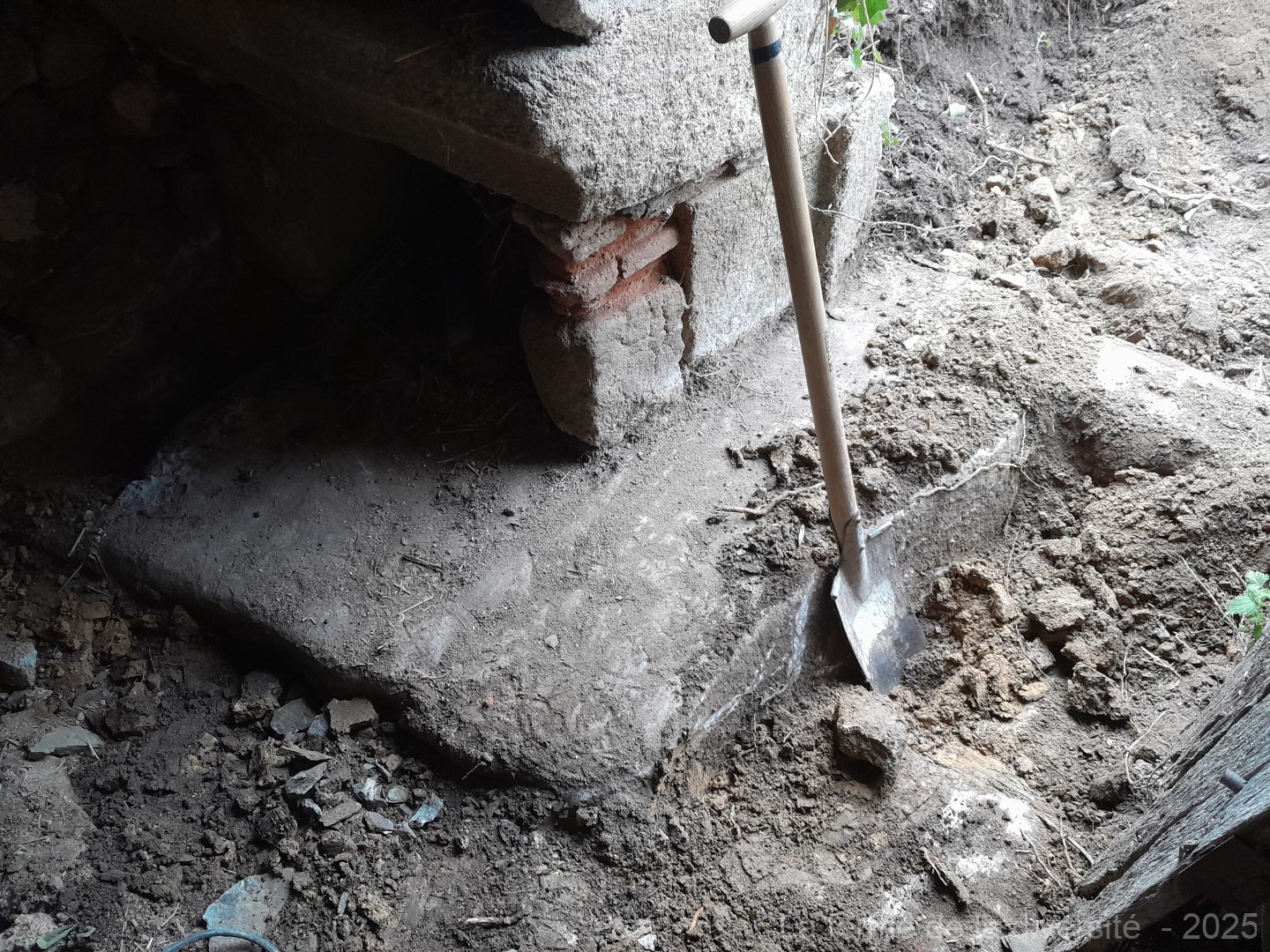 Bij steekproeven was ik op dunne granietplaten gestoten, maar bij de achterdeur blijkt een dik blok graniet te liggen. Verwijderen? Niet echt. Verplaatsen? Ook niet. Het graniet hield zich aan zijn contract: blijven liggen. Wel iets om mee rekening te houden want de bovenzijde van het blok is namelijk de voorziene bovenkant van de toekomstige vloer.