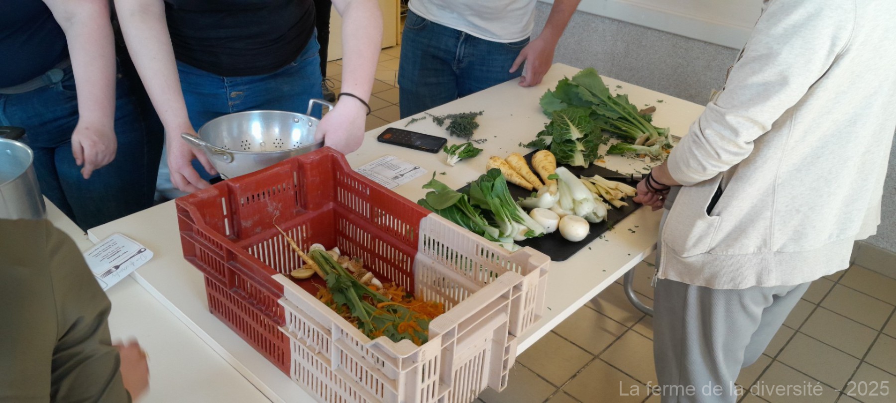 We begonnen met het plukken van enkele kruiden zoals munt, citroenmelisse en wat blaadjes van de zwarte bes. Daarna gingen we naar de Salle de Fêtes van Vijon, één kilometer verderop, om samen de maaltijd te bereiden.